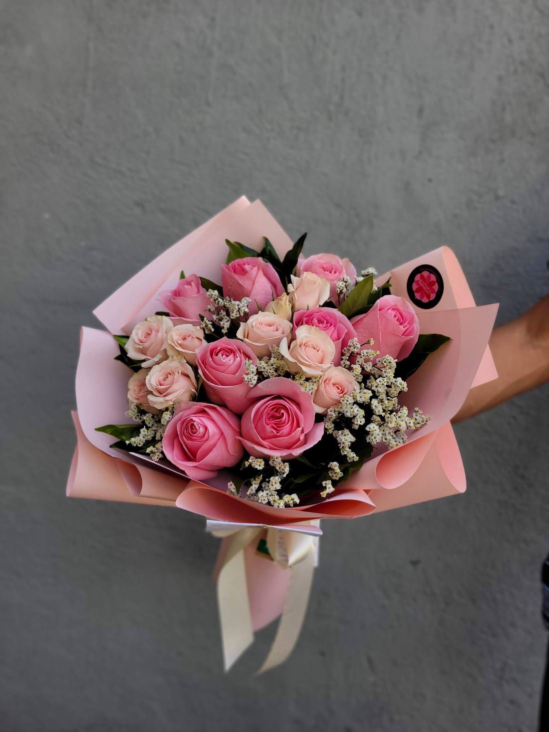 Ramo de rosas ecuatorianas y mini rosas en todnos rosados, acompañadas de flor de temporada.