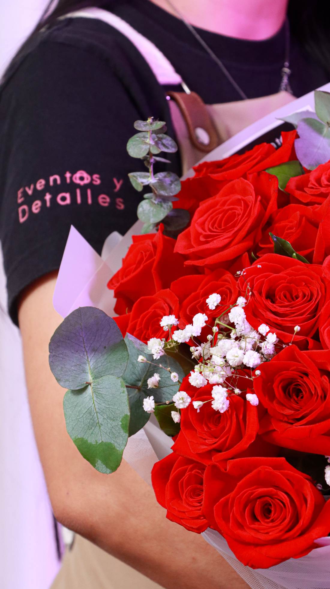 Ramo con 24 rosas rojas tradicionales con toque de flor blanca y follaje de temporada