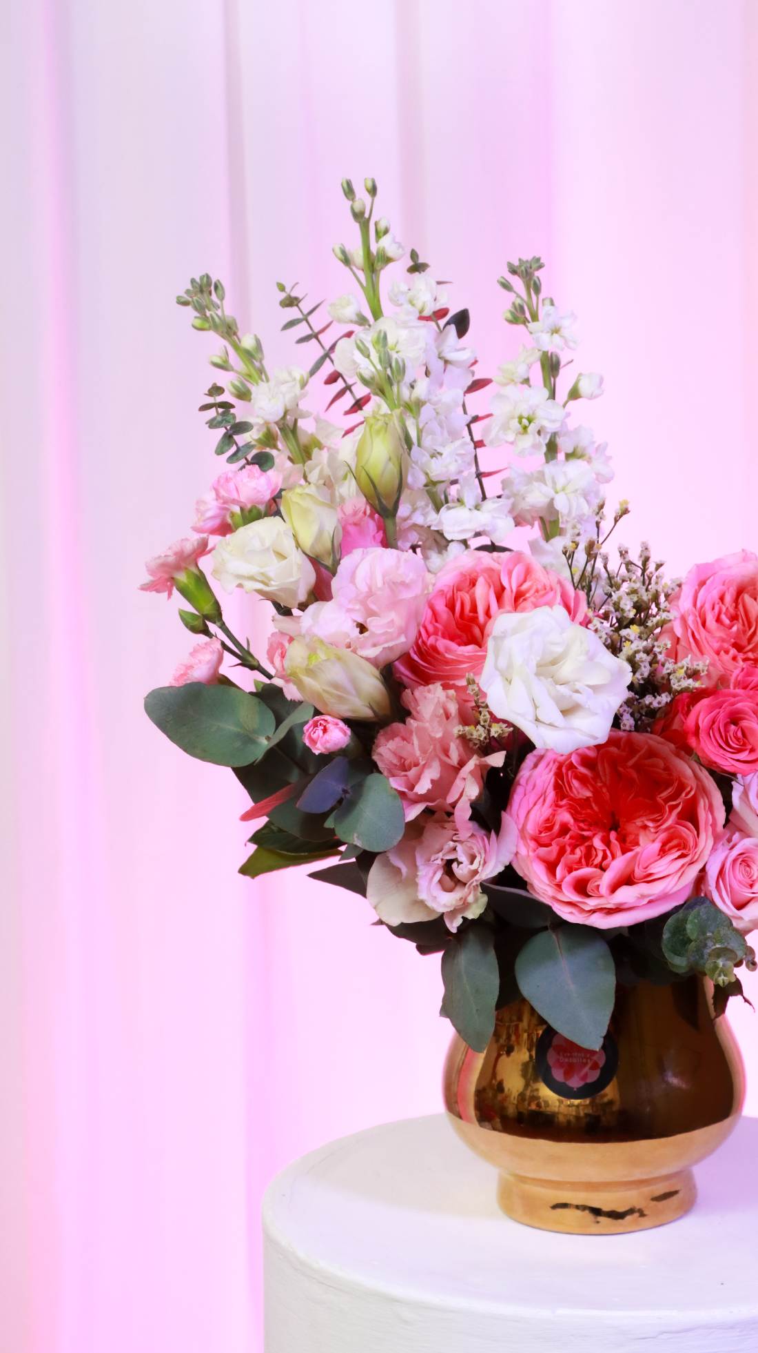 Composición en base de cerámica dorada con flores premium de calidad ecuatoriana entre rosas, mini rosas, lisianthus, claveles, stock y garden roses. Un diseño Protagonista