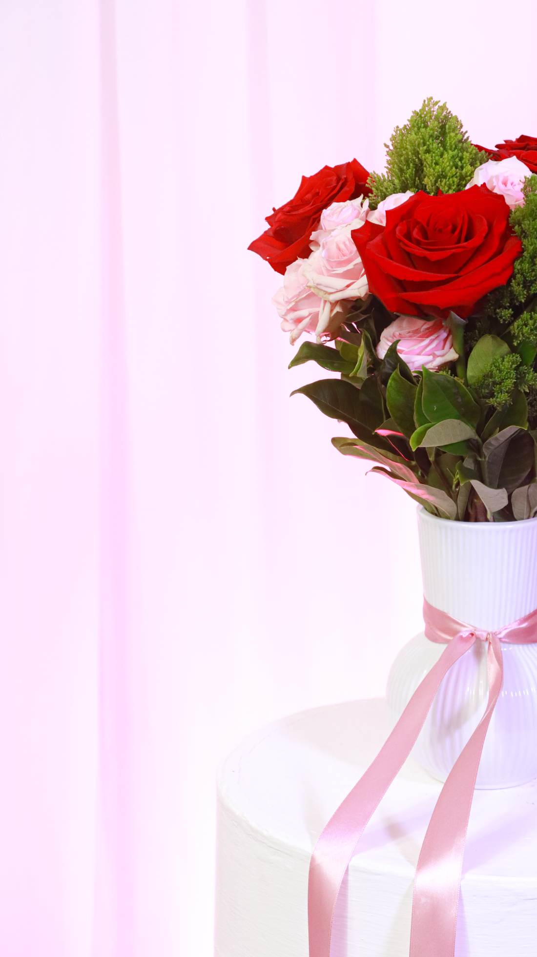Jarron blanco con 6 rosas rojas ecuatorianas, mini rosas rosadas y follajes de temporada