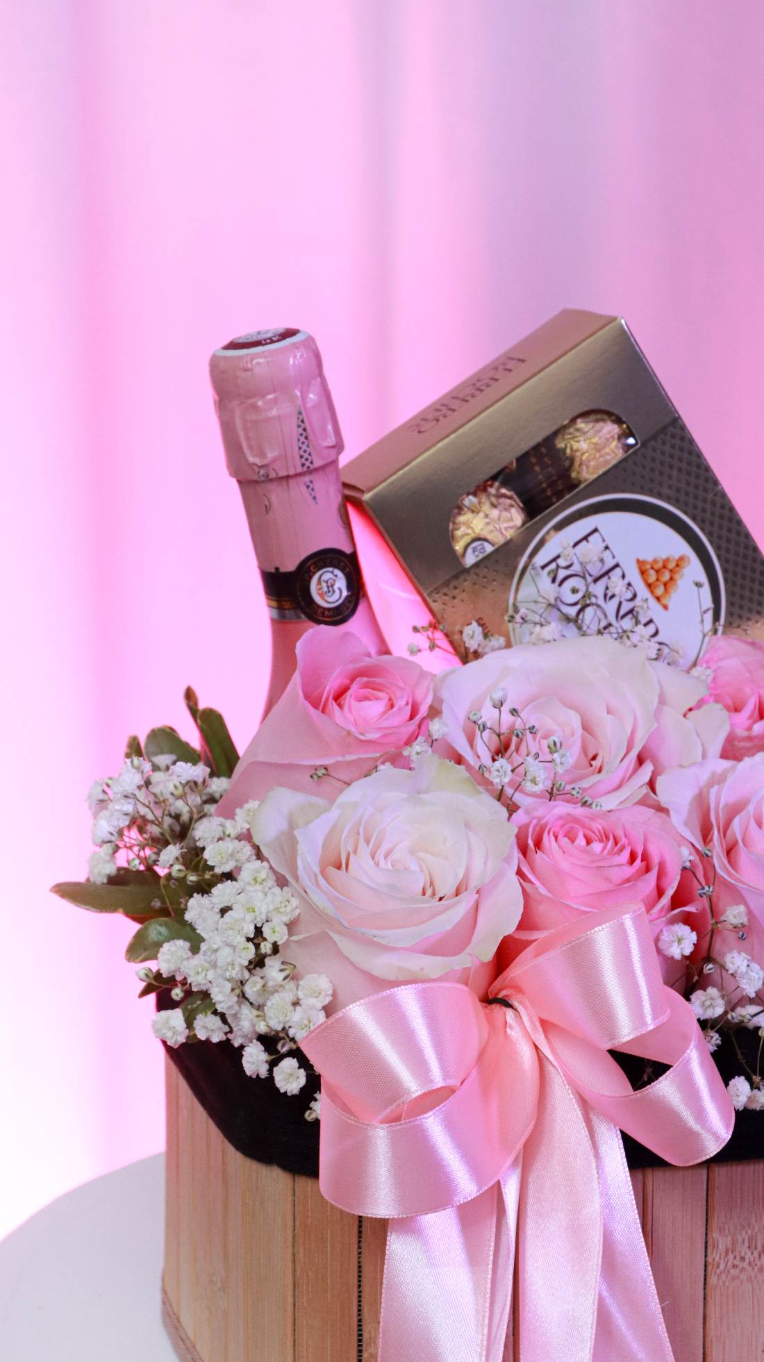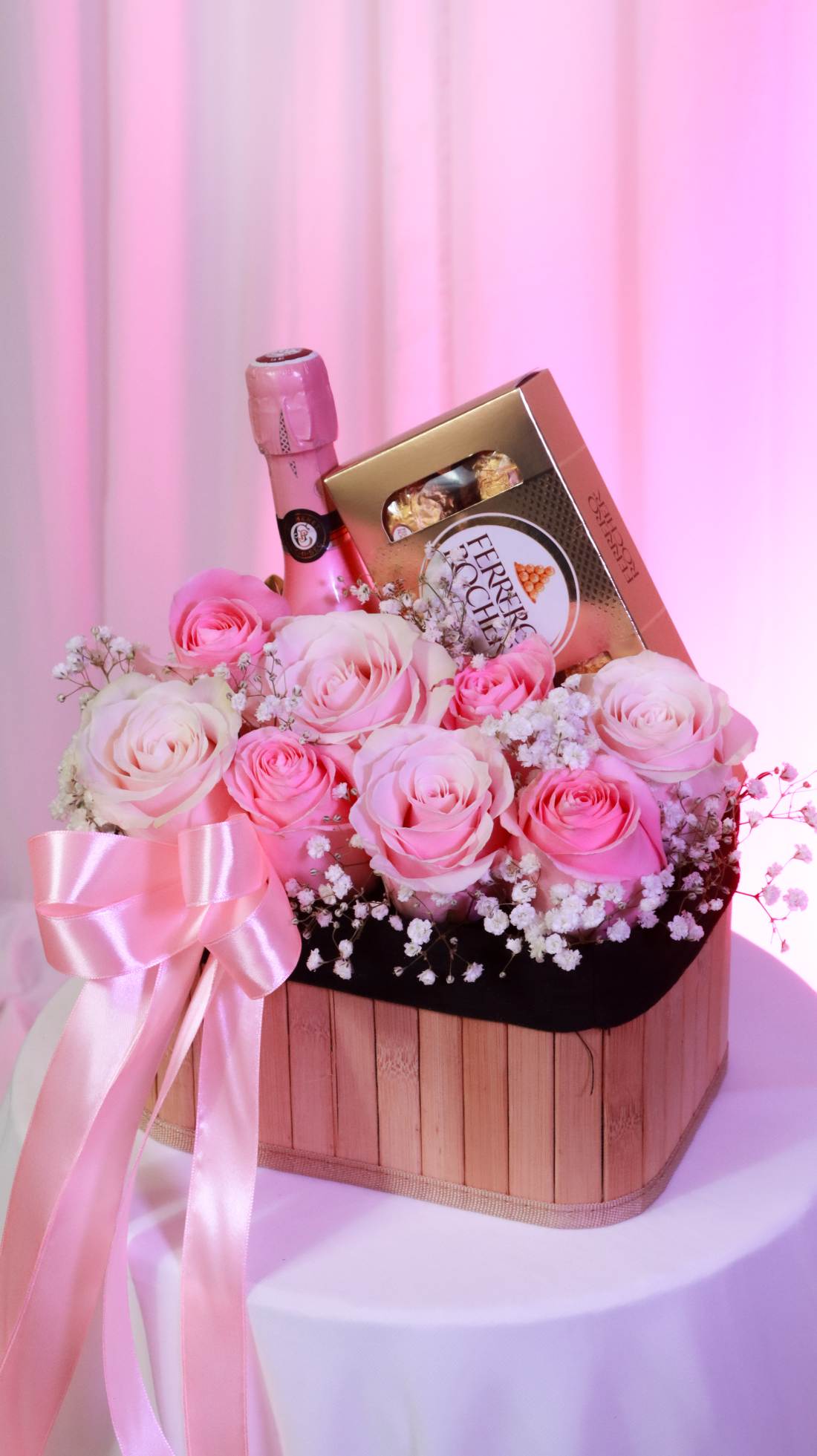 Cesta con 8 rosas ecuatorianas, toque de flor blanca más botella de vino marca J.P Chenet 200ml pequeña y caja con 8 chocolates marca Ferrero Rocher