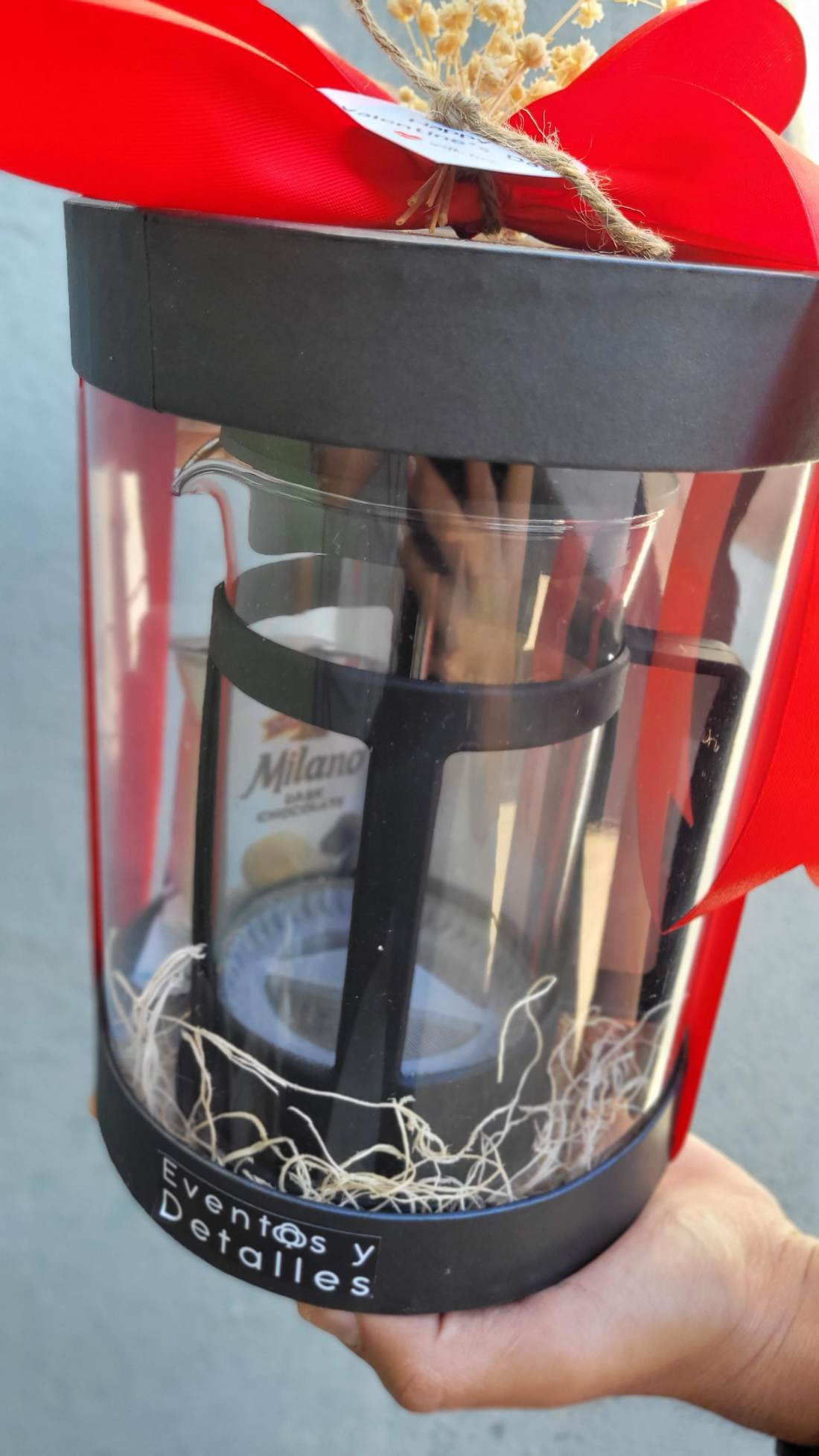 Box circular decorada acompañada cpn prensa francesa para café, 1 bolsa de café molido de 100 gr iCafecito y 1 galleta