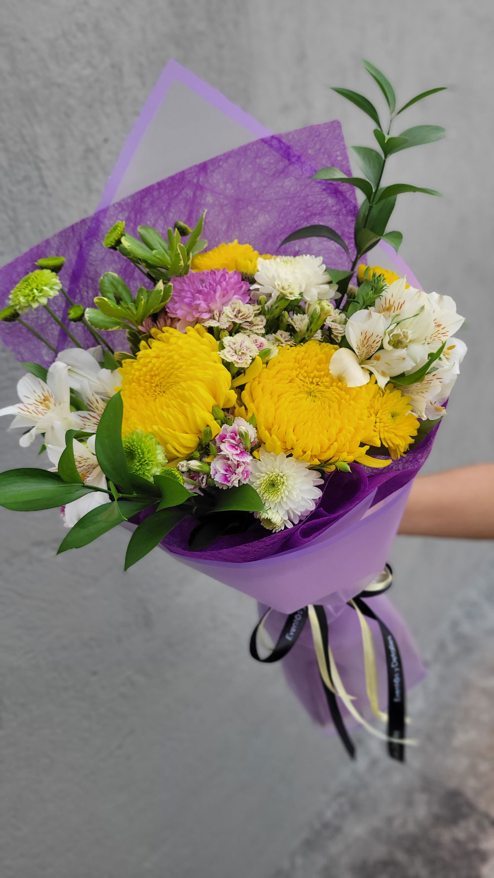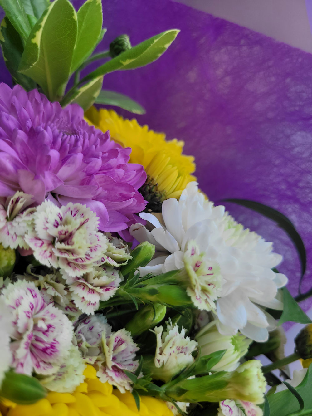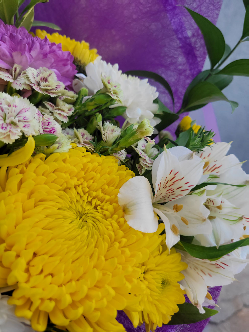 Ramillete con crisantemos, flores en tonalidades blancas, amarillas y moradas con follaje de temporada.