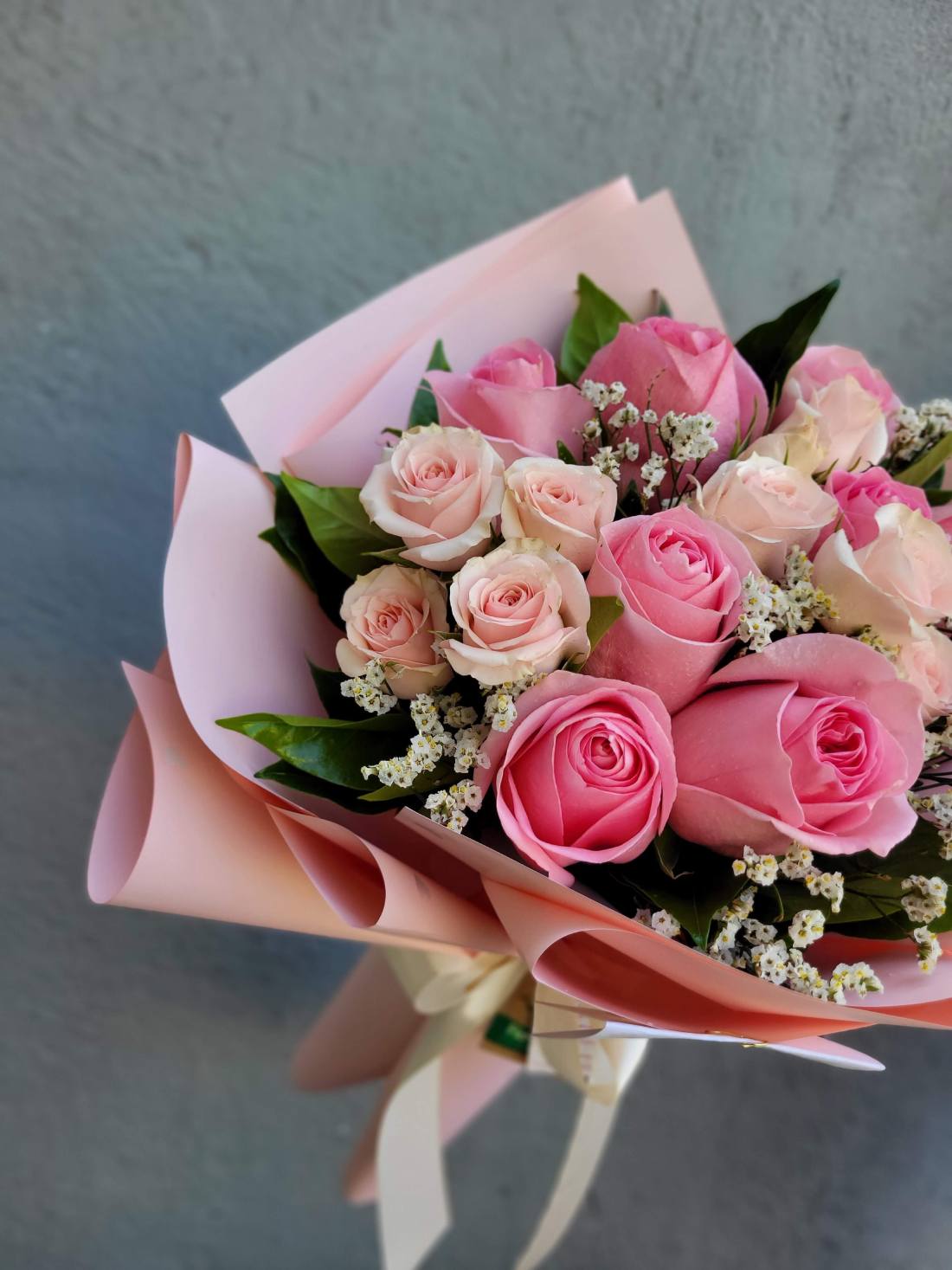 Ramo de rosas ecuatorianas y mini rosas en todnos rosados, acompañadas de flor de temporada.
