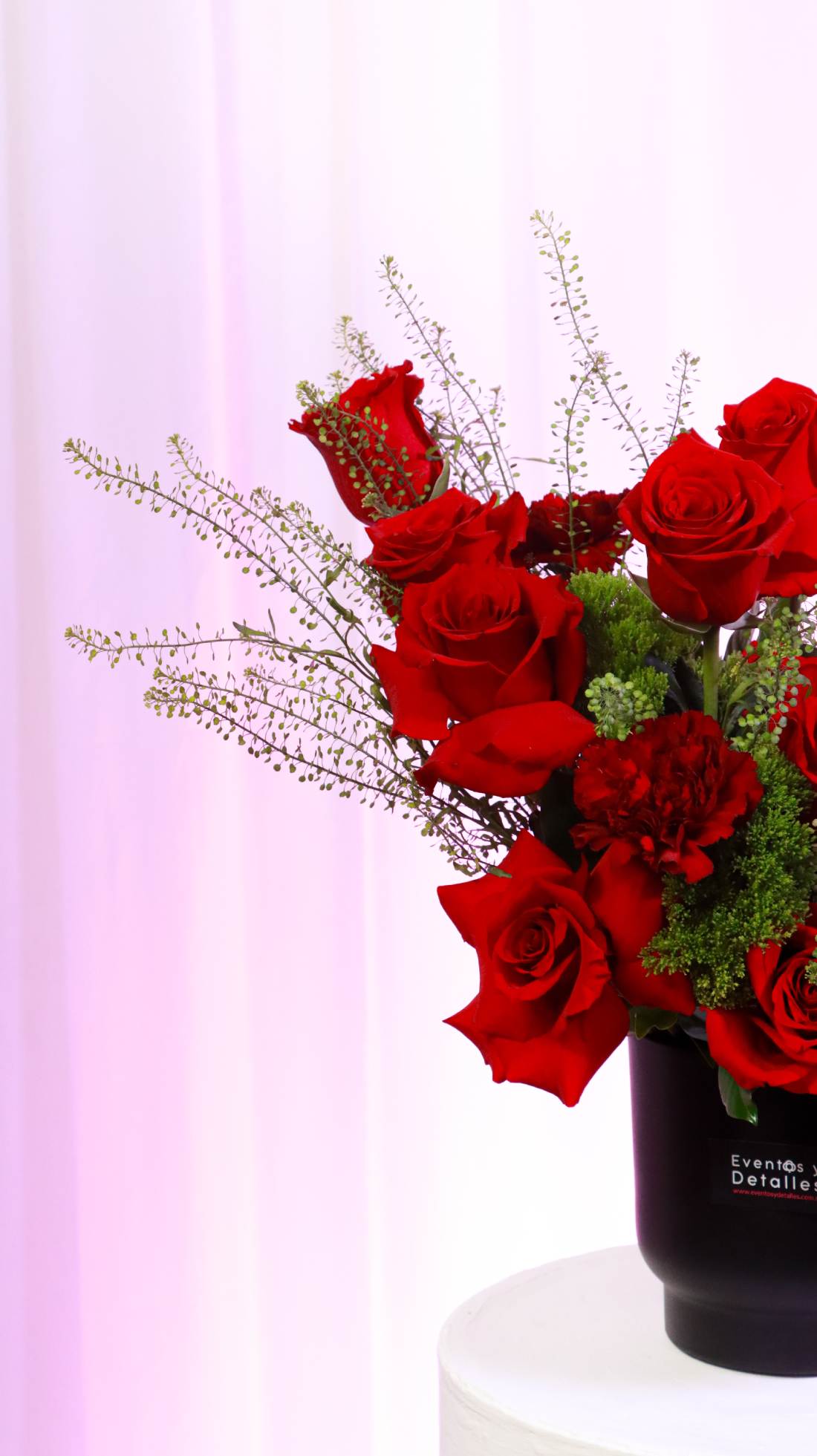 Elegante diseño en base de cerámica con 12 rosas ecuatorianas, claveles y diferentes follajes de temporada