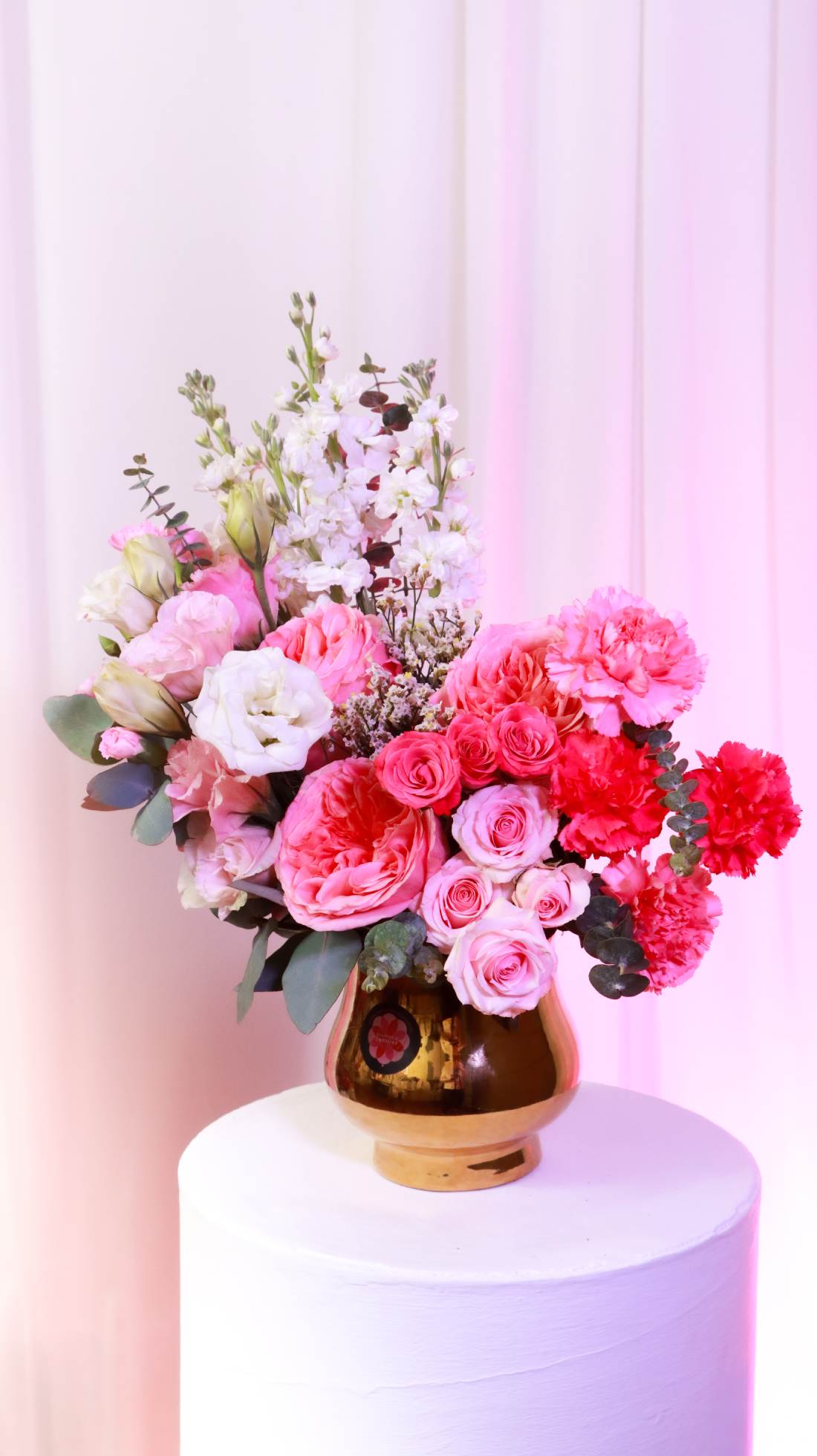 Composición en base de cerámica dorada con flores premium de calidad ecuatoriana entre rosas, mini rosas, lisianthus, claveles, stock y garden roses. Un diseño Protagonista